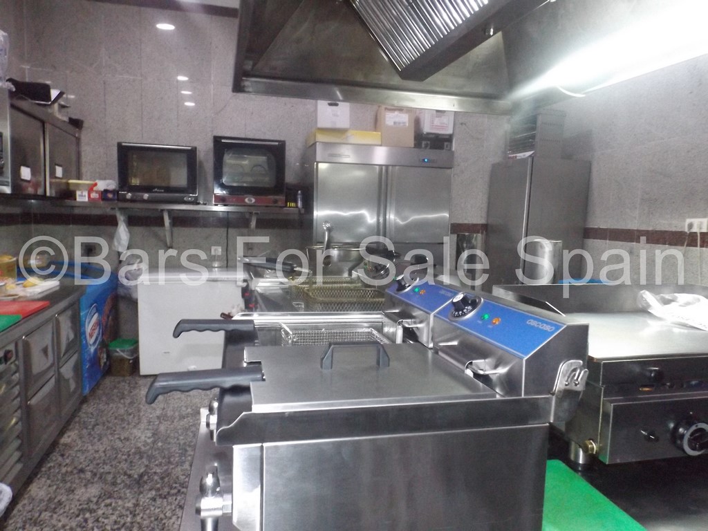 Then you arrive at the kitchen which is completely in stainless steel and tiled from ceiling to floor. In an immaculate condition the kitchen comprises a central cooking area. This area is complete with fryers, plancha (griddle), a 6 burner industrial hob with oven and has full extraction overhead.