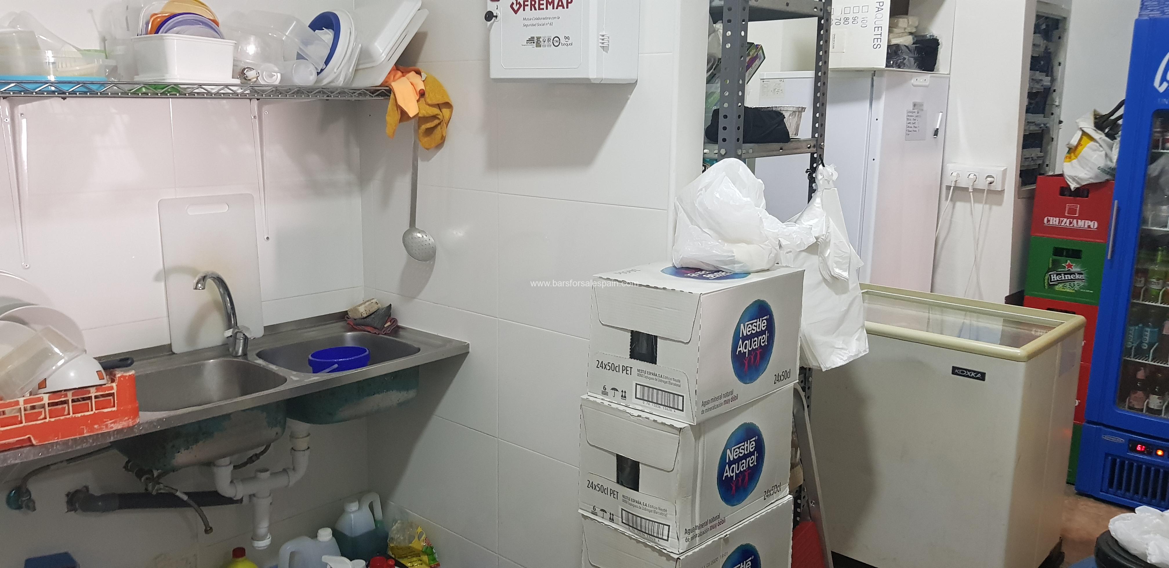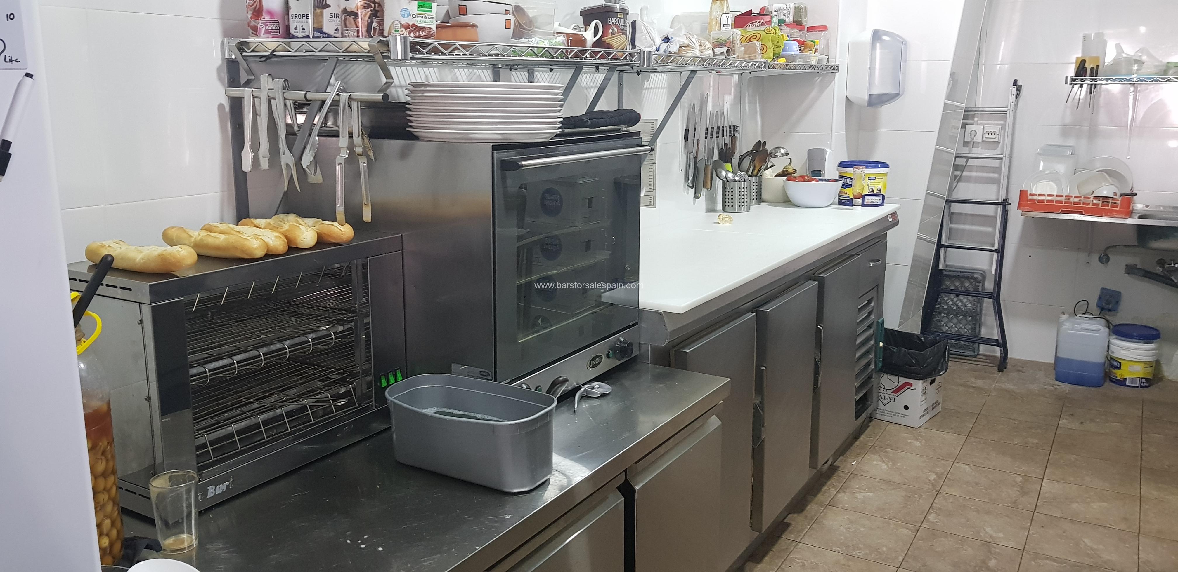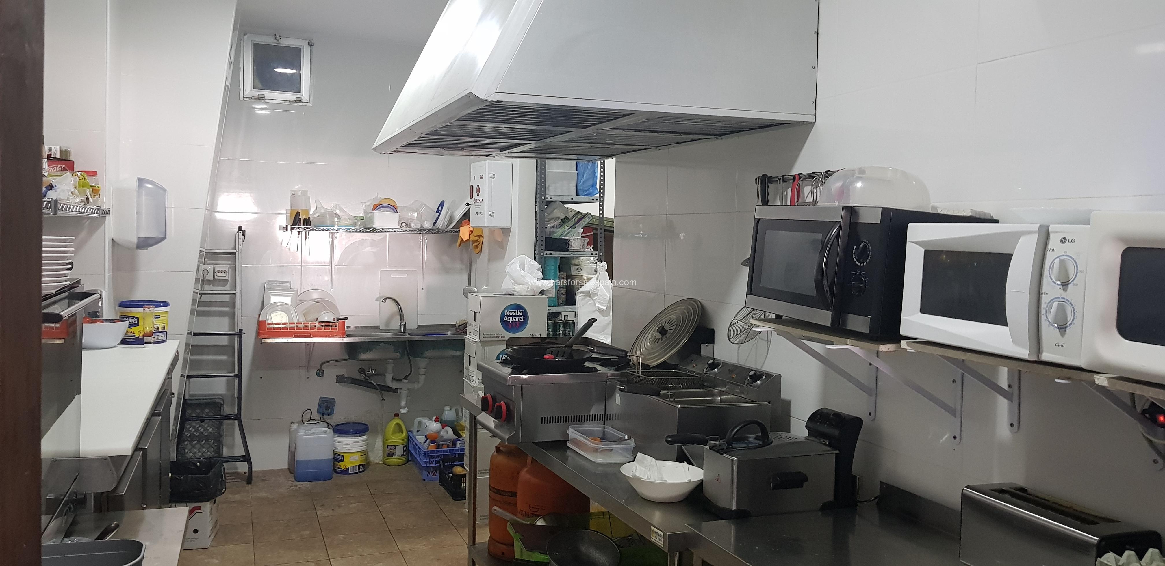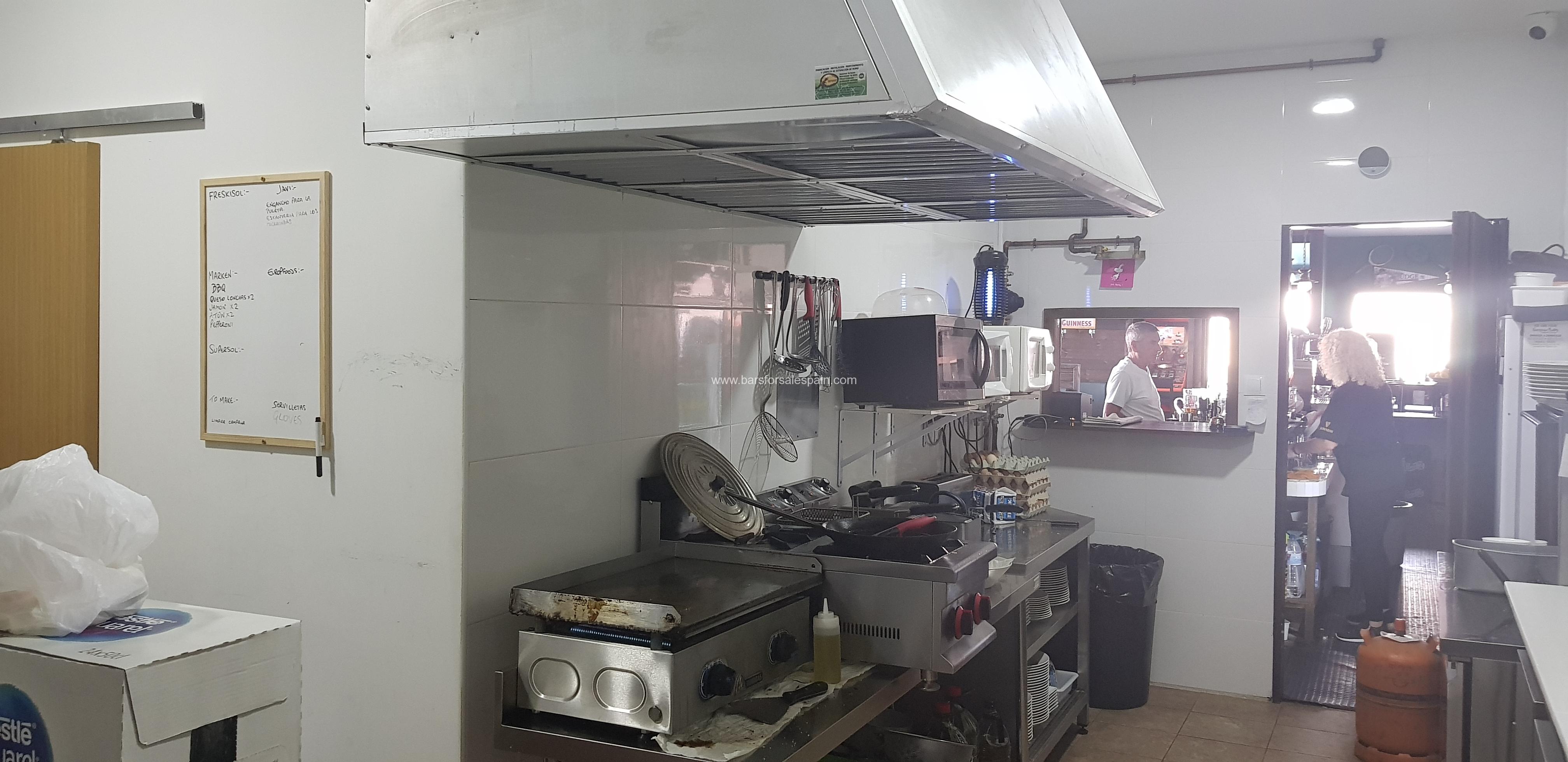 This area is located on the opposite side which is behind the bar and comprises an industrial cooker with 4 burners and a hot plate, 3 burner plancha, double fryers, full extraction, work benches and fridges.